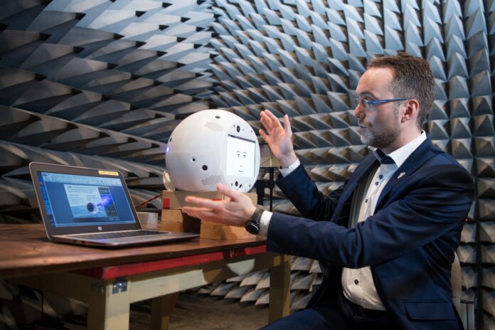 Till Eisenberg the head of the CIMON (Crew Interactive Mobile Companion) project at Airbus Defence and Space, holds the sphere-shaped AI companion. (Felix Kästle/picture alliance via Getty Images)