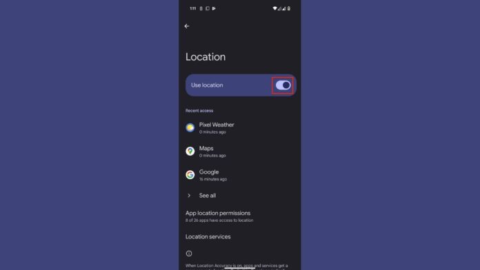 - Toggle off where it says Use Location so it turns gray. This will disable location sharing on your Android.