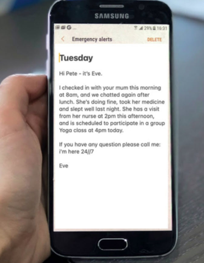 He goes on to say, “There is no replacement for human care. Obviously, the ideal scenario is for somebody to have human interaction, but I do think that Eve can help do some of the work traditionally associated with social companions. She can do health check-ins in the morning and at night. If somebody needs to reach out, they can talk with Eve and send alerts, 24/7. I think she can address some of the gaps humans aren’t able to provide and act as an addition to the caregiver.”