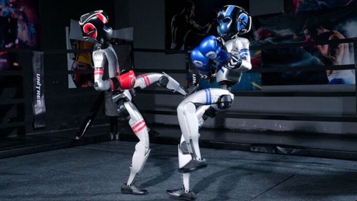 Standing 4.3 feet tall and weighing 77 pounds, the Unitree G1 is built for agility. With 23 degrees of freedom and powerful knee joints, these robots can throw hooks and side kicks and recover quickly after a fall. They may look a bit clunky in action, but their movements are surprisingly fluid and engaging.