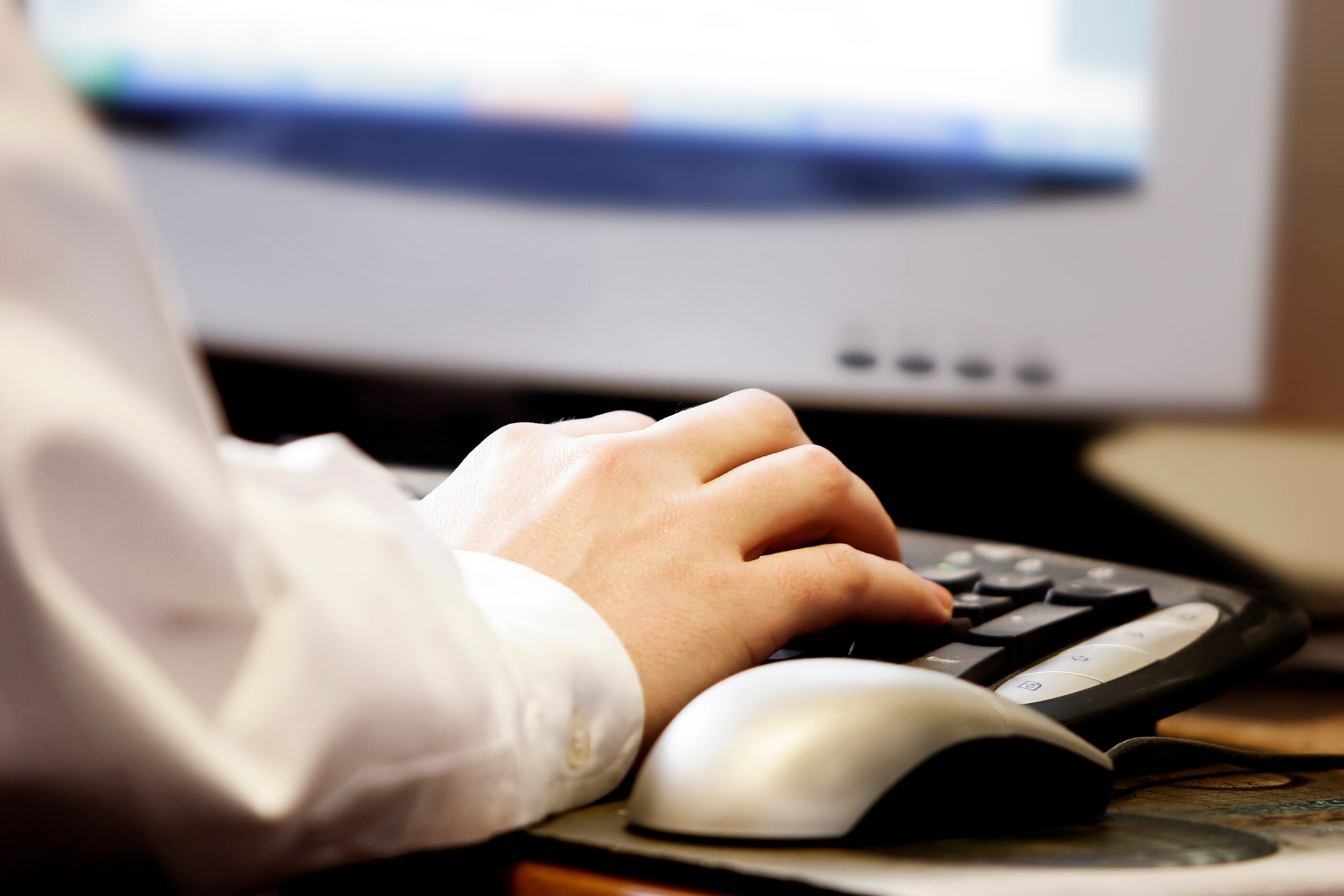 Close-up of a man’s hand typing on a computer keyboard, with monitor and mouse. (LincolnRogers)
